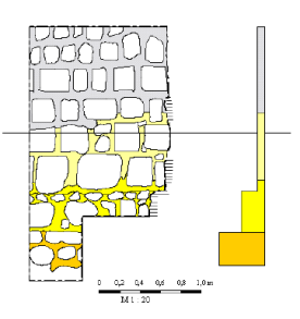 Bei den archäologischen Untersuchungen konnte eine mehrperiodige Errichtung der Fundamente nachgewiesen werden, das aufgehende Mauerwerk konnte wegen der Neuverfugung mit Zementmörtel nicht näher angesprochen werden.