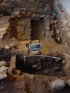 Wegen der großen Eingriffstiefe boten sich im Seitenflügel die besten Möglichkeiten zur Erforschung der Bau- und Nutzungsgeschichte der Anlage. Aus statischen Gründen musste in etwa 1 Meter breiten Schlitzen gegraben werden.