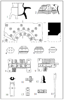 Außerdem wurden Reste von mehreren Kämmen gefunden, Nr. 8 und 9, deren Verzierung mit konzentrischen Kreisen eine Herstellung in der selben Werkstatt vor Ort nahe legt. Die beiden Kämme lassen sich aufgrund der Form ebenfalls ins 12. oder frühe 13. Jahrhundert datieren.