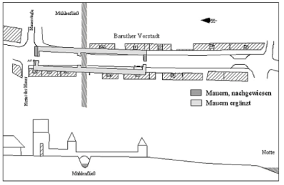 Da die innere Mauer des Mühlentores bei den archäologischen Untersuchungen auf der Kreuzung Mauerstraße–Yorckstraße nachgewiesen worden war, lag es nahe, für die Deutung des Befundes an das einst hier stehende Bauwerk zu denken. Im Bereich des Mühlenfliesses waren ebenfalls starke Feldsteinfundamente bei Bauarbeiten beobachtet worden. Bei der Mauer in der Baruther Vorstadt dürfte es sich also um die feldseitige Außenmauer des Mühlentores gehandelt haben, Abb. 2. Es wäre demnach als insgesamt etwa 75 m langes Zwei-Kammer-Tor zu rekonstruieren. Die Notteniederung hätte dabei als Annäherungshindernis vor dem äußeren Tor gedient, das Mühlenfliess vor dem inneren Zwinger.