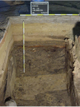Schnitt 2 lag vor dem Stützpfosten der Empore, im Westen des Kirchenraumes. Als älteste Schicht wurde ein begrabener Humushorizont mit spätbronzezeitlicher Keramik erfasst. Er wurde von einer